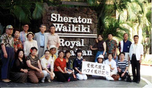 20年前の創立七〇周年記念の会の後の同期会でわき上がった遠い夢を企画した。なにせ還暦とは言っても、男性は未だ現役、女性は家の要。参加人数を危惧したが、企画の呼びかけに全国に散開している同期生20名(男性8名、女性12名)が参加した。この時ばかりは、同期幹事の内海光啓君のコネを最大限に利用させて頂いた。参加者の半分以上が海外旅行初体験であったので、四泊六日という駆け足旅行ながら、格安より、安心・安全を感じる企画が第一と心得た。なんといっても、ワイキキ海浜のシェラトンワイキキホテルで全員オーシャンビューの部屋は参加者を喜ばせた。2日目はオアフ島一周、途中花飾り、フラダンスの実習と童心に返ってはしゃいだバス旅行であった。3日目はマウイ島周遊、海面から標高3000m級のハレアカラ山頂までバスで一気に上る。マグマに直結するも2000年の眠りにある世界最大の広大な静まりかえった火口原に驚嘆、サトウキビ列車を満喫する。4日目は楽しい自由行動、思い思いの行動で、ショッピングに出掛けるもの、ワイキキの浜で日光浴を楽しむもの、久しぶりの海水浴に浸るもの、オアフ島を上空から感激の観覧飛行に出掛けるもの、10ドルでワイキキ沖の白人の女性陣に囲まれた遊覧船へ・・・・と多岐にわたって,自由時間を満喫。帰りの飛行機は疲労感と満足感でただただ眠り込んだ。