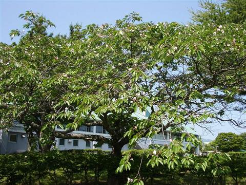 室蘭ゴルフ倶楽部・白鳥コースでコンペがあり1番ホールに集合したら、この夏の真っ最中に八重桜が咲いていました。