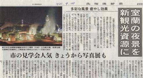 いま、室蘭ではこの空気の澄み切った秋の夜景探訪が人気を博しております。先日、第1回の夜景見学を催したところ40人の参加者があり盛会だったようです。また、10月28日にも第2回目が予定され現在参加者を募集しています。室蘭の魅力が見直されています。