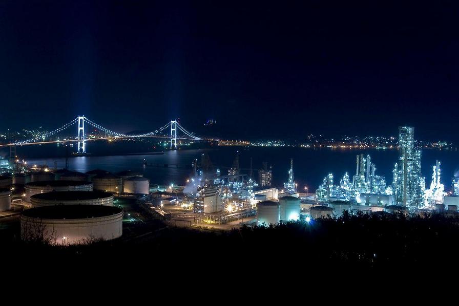 白鳥大橋や測量山のライトアップ、光の輝く工場群、そして満月の地球岬など他の都市では見られない美しい夜景が広がっています。