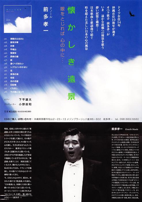 一昨年東京白鳥会第2回総会のアトラクションに沖縄より出演して頂いた前多孝一さんが「懐かしき遠景」と題して日本歌曲と歌謡曲を織り込んだCDを発表しました。時を超えた美しい日本の風景が詰まった素晴らしいCDです。