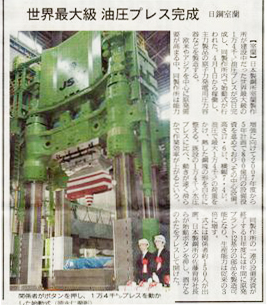 日鋼室蘭に世界最大の油圧プレス完成! 室蘭便り 2010.04.03 日鋼室蘭に世界最大の油圧プレス完成! 3月25日に日鋼室蘭で世界最大の1万4千トンの油圧プレスが完成し、4月1日から稼動するようです。 これまでにも原子力発電設備関連の受注が多かったのですががこれで世界各地からの需要に対応できるそうです。 この不況の中でも日鋼室蘭は午前水に独身寮のアパートを建設するなど設備投資に旺盛です。 地域経済の活性化に寄与するものと思われます。 室蘭より 10期卒業生:大場龍雄さんからの話題です。