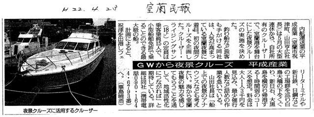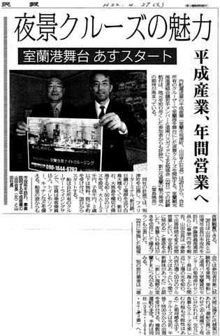 内航運送業の平成産業が4月28日から室蘭港を1周する4~50分のコースで3千円の設定で運行するようです。