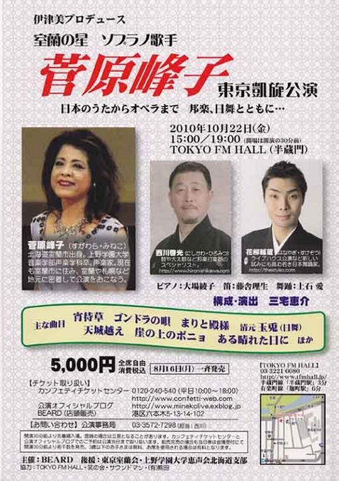 菅原峰子さん コンサート お知らせ 2010.09.07 室蘭在住の菅原峰子さんコンサートのおしらせ 10月22日(金)15:00/19:00 TOKYO FM HALL(半蔵門) 菅原峰子さんは室蘭にて声楽家として活躍しています。栄高校16期卒業の菅原敏明さんの奥様です。 当日は菅原敏明さんも室蘭から上京し昼夜会場にいるそうです。