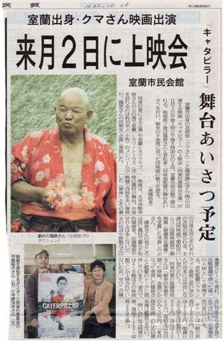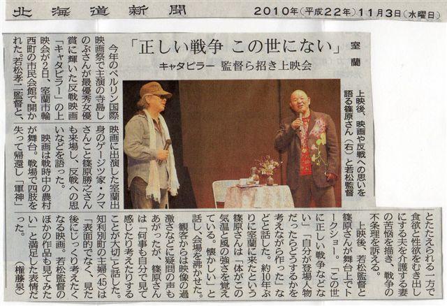 鉄の芸術家クマさん(栄11期生)が映画のトークショー 室蘭便り 2010.11.042026.01.29 鉄の芸術家クマさん(栄11期生)映画の トークショー 鉄の芸術家クマさんが反戦映画「キャタピラー」に出演したことで、映画の上映会が11月2日に室蘭市民会館で開かれクマさんが来蘭し、映画の若松監督とトークショーを繰り広げ話題となりました。 私は観に行けなかったのですが、映画の訴える内容と二人のトークショーでクマさんも以前にNHK室蘭のオブジェ製作以来の来蘭で懐かしげだったようです。 記事:室蘭より栄10期生/大場 龍雄