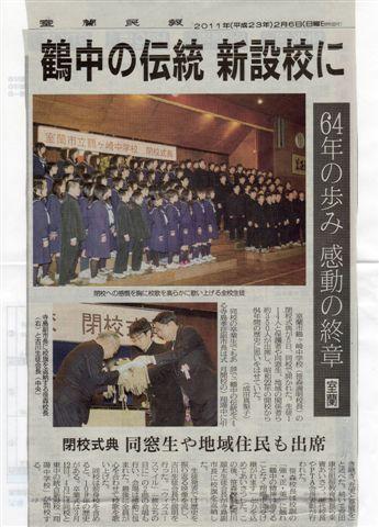鶴ケ崎は1902年に開校、戦後新制中学となり64年の歩みを続けてきましたが、実に109年と言う長い歴史に幕が降りました。4月からは東中と統合し翔陽中学として出発します。