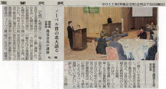 札幌白鳥会新年親睦会と講演会開催 室蘭便り 2011.03.042026.01.29 札幌白鳥会新年親睦会と講演会開催! 昨年9月に設立された札幌白鳥会の新春懇親会が去る、2月26日に開催され、ノーベル賞と北大について会長の逸見勝亮北大副学長(栄高校12期が講演されたようです。 今後の発展が期待されます。 記事:室蘭より 10き卒業生/大場 龍雄さん