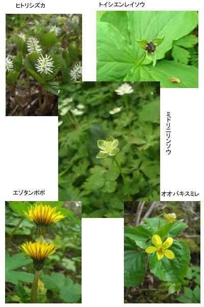 今咲いている花々。エゾタンポポはセイヨウタンポポでないことは確実ですが、ニホンタンポポかも知れません。