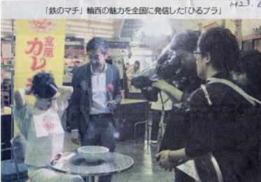 新聞の記事のように西村知美さんが輪西7条のプラットてついちで室蘭ヤキトリやカレーラーメンのPRをしてくれました。