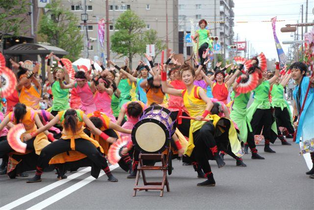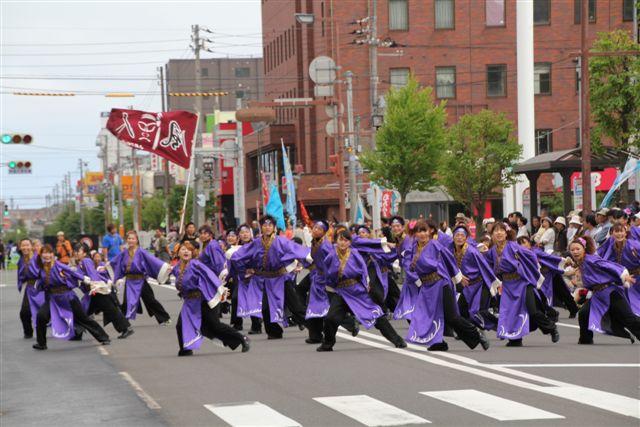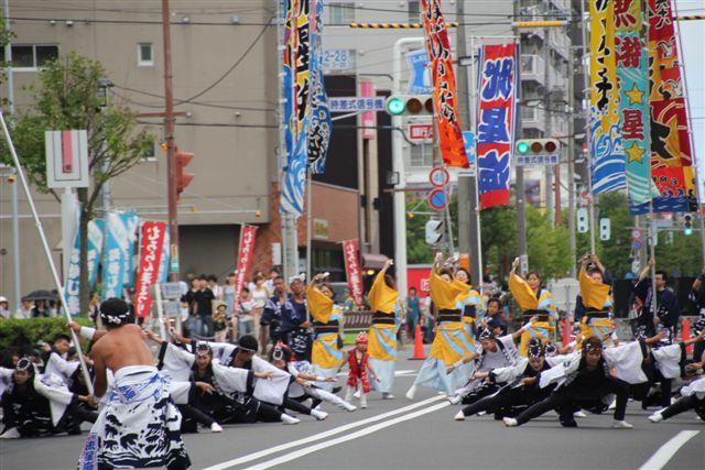 室蘭のルネッサンス、鯨翔舞、百花繚乱のほか伊達、札幌など各地のよさこいチームが競っていました。