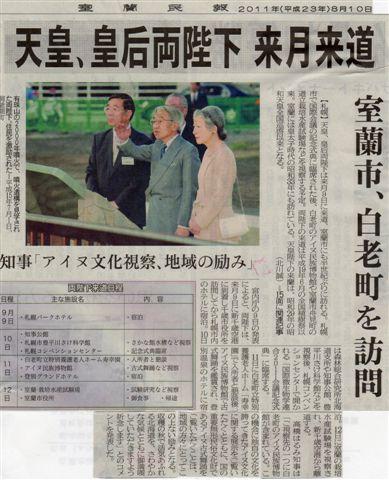 天皇陛下 9月12日室蘭追直漁港を御視察予定 室蘭便り 2011.08.112026.01.29 天皇陛下 9月12日室蘭追直漁港を御視察予定 天皇陛下が9月9日から12日まで北海道に来られる予定が宮内庁より発表されました。 札幌での微生物学会に臨席され、白老のアイヌ民族の古式舞踊を鑑賞し、登別温泉に宿泊して、12日に室蘭市の追直漁港にある栽培水試を視察され帰途に着かれる予定となっています。 室蘭では市役所で昼食のとる予定となっていますが陛下は昭和33年に皇太子の時代に訪れているそうで、53年ぶりとなるようです。市民や関係者が心待ちにしているようです。 大場