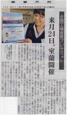 全国工場夜景プレサミット 室蘭便り 2011.08.312026.01.29 全国工場夜景プレサミット開催予定! 9月24日に室蘭で来年開催の全国工場夜景サミットのプレサッミトを開く予定で準備されています。 基調講演のほかボルタの体験製作や夜景の散策も行われるようです。今後の夜景への取り組みが期待されます。 記事:室蘭より 10期卒業生/大場 龍雄さん