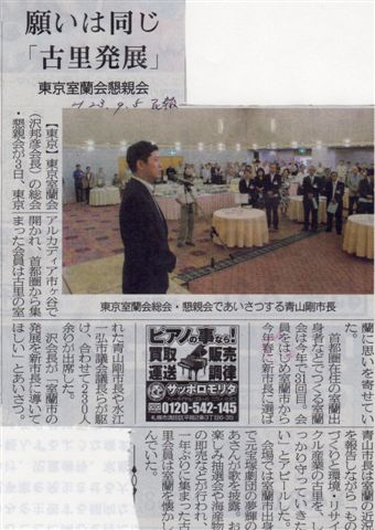 東京室蘭会開催! その他 2011.09.072026.01.29 東京室蘭会開催!青山市長出席 9月3日に行われた東京室蘭会の総会の様子がこちらの室蘭民報にも大きく掲載されていました。 今年は新市長の青山氏や元宝塚スターの夢輝のあさんが参加され、盛大に挙行され様子が報じられました。 室蘭より:10期卒業生 大場 龍雄さん