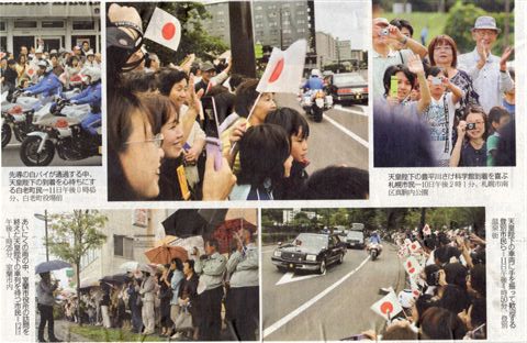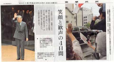 天皇陛下来蘭!沿道で感激のお出迎え 室蘭便り 2011.09.142026.01.28 天皇陛下来蘭!沿道で感激のお出迎え 9月12日に天皇陛下が来蘭され、多勢の市民のお出迎えを受け、室蘭市内では追直漁港の水産栽培試験場を視察し、 室蘭市役所で青山市長の出迎えをうけて、市役所内で市長と水江市議会議長と会食されました。 休息後、お茶受けとして草太郎の菓子「千寿栗」をお召し上がりになって室蘭を後にしました 私どもも光栄のことと喜んでいます。 皇后陛下が来れなかったのは残念でしたが多くの市民が沿道から送迎し、感激していました。 記事:室蘭より/10期祖卒業生 大場龍雄さん