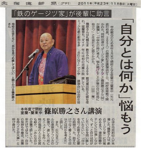 去る11月7日に室蘭市立蘭東中学の閉校記念で鉄の芸術家くまさん(11期卒業生:篠原勝之さん)が同校卒OBとして「自分を考えよう」題して講演を行いました。