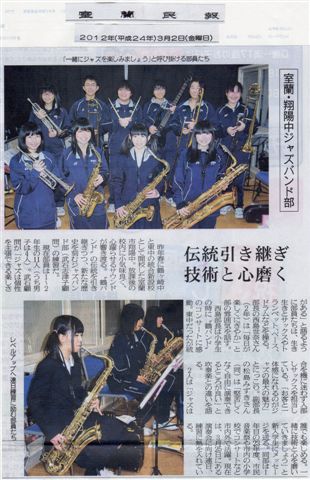 >翔バンド、演奏会に向け猛練習! 室蘭便り 2012.03.062026.01.29 翔バンド、演奏会に向け猛練習! 翔陽中のバンド演奏会が今月25日に迫り、今、練習に励んでいるところです。 今年度も終りに近づき、卒業生と在校生とが一緒になって最後の仕上げに取り組んでいるところです。 これが終わって新学期を迎えるとまた、新たな部員を募集し、さらに充実したバンドを目指して新たな出発となります。 25日の演奏会を楽しみにしています。 室蘭より:10期卒業/大場龍夫さんより