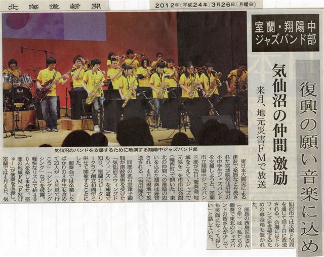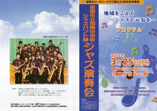 今回は室蘭北ロータリークラブの主催で東北の震災地に向けて元気を出してもらおうということでFM放送の室蘭FMびゅ~の協賛で開催されたもので、宮城県気仙沼市のジャズバンド・ドルフィンが頑張っている様子を映像で流され、双方が交流して震災地の方に元気を出してもらおうと翔陽中のバンドのメンバーも一生懸命に演奏している様子が伝わり感動しました。