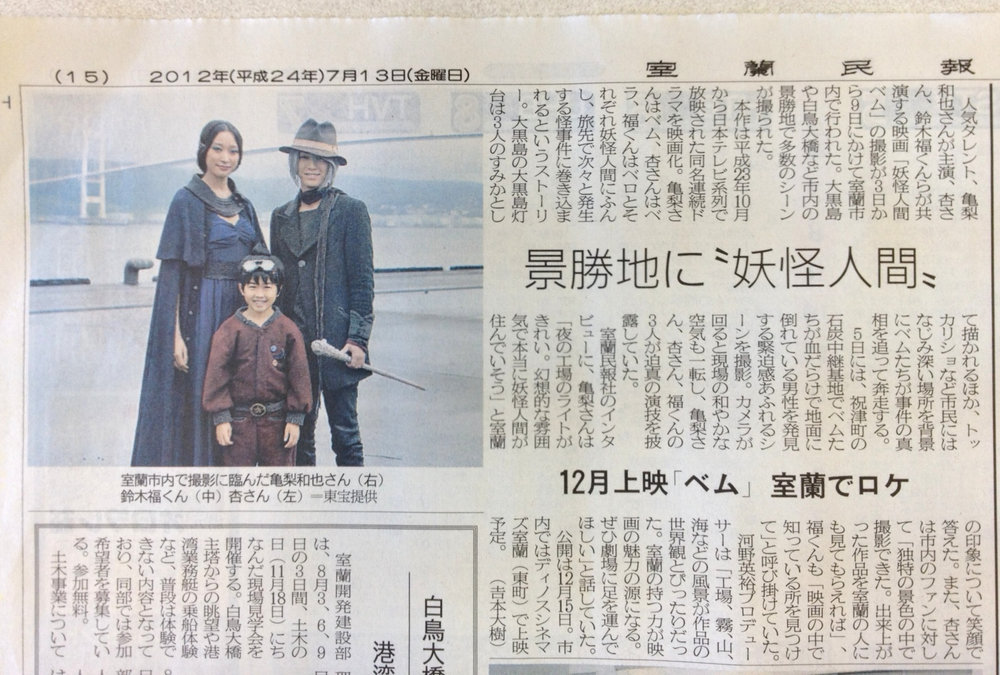 7月23日の「妖怪人間ベム」のロケ終了!」記事の追加版です。大黒島の大黒島灯台が3人のすみかとして描かれているほか、トッカリショなど室蘭市民になじみ深い場所を背景に、多数の映画のシーンが撮られたそうです。妖怪人間ベム役の亀梨さんのインタビューと詳しい撮影のもようは、室蘭民報の記事をご覧下さい。