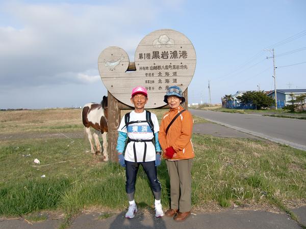 八雲町黒岩漁港カンバンをバックに妻「泰子」と