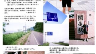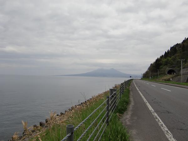 国道をどんどん南下すると徐々に若葉の色が濃くなってくる。ヒトリシズカなどの春の野草も道端に咲いている。ミズバショウも発見。坂道の繰り返しと、トンネルが次から次と現われる。トンネルの歩道は狭く、トラックの風圧に身体がよろめく。一番長い礼文華トンネルは1462メートルもありなかなか出口が見えてこない、空気もヒンヤリ、身体が冷えてくる。休憩地点で長そでのシャツに着替える。いつのまにか空は曇ってきて、最大の難所「静狩峠」のトンネルを出ると急に雨が降りだす。100円ショップで買ったカッパを着て、体温を確保する。道は下りになり、JR室蘭本線の線路を超えると平坦な直線道路になる、走れども、走れども目の前の景色は変わらず。山本卓さんが言っていた「自分が走っているかどうかわからなくなる」という状況が理解できた。頼りは国道のキロ標識、1キロ毎にある標識をみて進み具合を確認する。キロ6.5分のイーブンペースが維持できている。やっと長万部に入り国道37号線と別れて、国道5号線に出る。長万部名物の「かにめし弁当」を食べたかったので、ドライブインで休憩する。そこから今日の目標地点八雲町黒岩まで残り20キロである。またもや直線道路が続く。相変わらずペースはキロ6.5分のイーブンペースを保っている。16時40分黒岩漁港のカンバンの前でゴールとする。今日の走行距離は58.8キロだった。ちょっと長かった気がする。