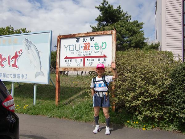 9時00分黒岩漁港出発。天気は黒い雲がかなり低くたれこめ今にも降りだしそう。用心して長袖のシャツの上に半そでのTシャツを重ね着する。スタートはキロ7分のゆっくりペースで入る。南下するにつれ太陽が顔をだし、体感温度も上昇する。今日の道も平坦で一直線。最初のエイドは7キロ行った地点の「山崎駅前」ここで涼しいスタイルにお色直し。左側は噴火湾、次から次へと漁港を通過する、右側にはまだまだ冬の様子の山々が連なっている。陽は出ているものの、遠くの雪が残っている山脈から降りてくる風はやはり冷たい、道路の足もとからは温かい空気が這い上がってくる。上半身は涼しい風で比較的走りやすい。いつの間にかキロ6.5分のペースに上がっている。途中、早め早めにコンビニで買ったパンなどを補給する。やはりガス欠は体力、気力ともに落ちてしまうので禁物だ。落部の信を過ぎると急に展望が広がり、目の前に駒ヶ岳が飛び込んできた。これからは、駒ヶ岳を目標にし、景色を楽しみながら1キロずつ着々と刻む。時々JR函館本線を特急や貨物列車が通る。スタートしてから41.1キロ地点の蛯谷漁港で最後の給水をとり、着るものも半そでに着替える。目的地点の森町道の駅までは5キロ前後だ、1.5キロほど走ると、「道の駅3K」の標識があり、やっとゴールが見えた。キロ6.5分だと20分程度でゴールである。「道の駅1K」の地点から大きな建物が見える。もう少しだ、最後の500mは登りになるもものとはせず快調に脚がでる。14時10分ゴール。走行距離は47.5キロだった。