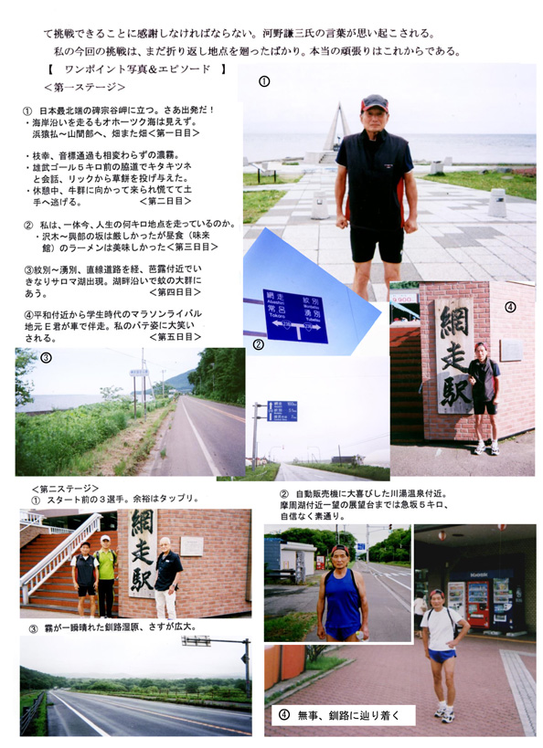 第一ステージは単独走。第二ステージは駅から駅を繋ぐもの。マラソンと駅伝の違い。どちらも自分との闘いには違いないが、マラソンは完走した達成感の自己満足があり、駅伝は受け持ち区間の責任を果たした喜びと、さらにタスキを繋いだ仲間達とで喜びは倍加される。泊先、摩周温泉と釧路での夕食は旬の魚をつまみに話が弾み、疲れも吹っ飛んだ