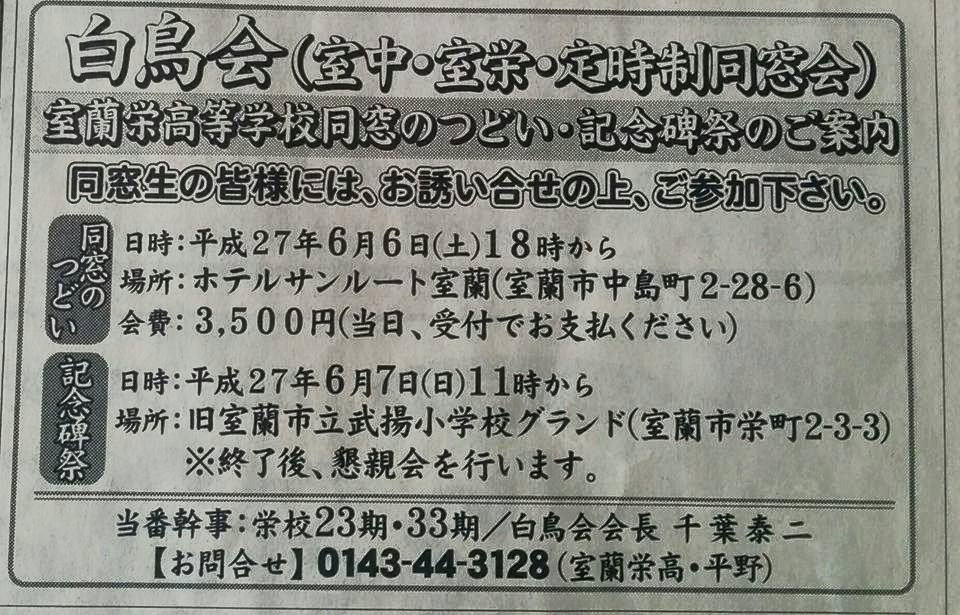 6月6日に室蘭で「室蘭栄 同窓のつどい」があります
