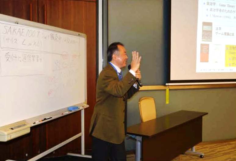 原事務局長から渡辺さんの紹介がありました。講演の内容はと言うと、2種類のコンビニチェーン店が2つの駅のどちらに出展したら得なのかをゲーム理論で考察した。