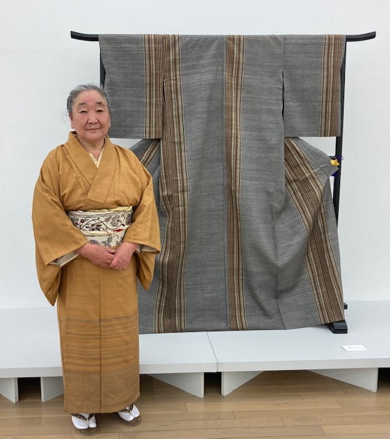 みちよさん作品は地が柏にお歯黒の焙煎を入れた糸を万筋に織り上げ、非常に手の込んだ深みを感じる、品格ある作品でした。ニセコで出会った美しい天の河をモチーフにされたのでそうです。