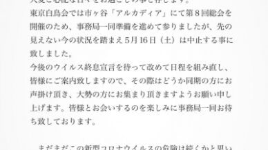 お知らせ 東京白鳥会「第8回総会・懇親会」中止の案内が郵送されました